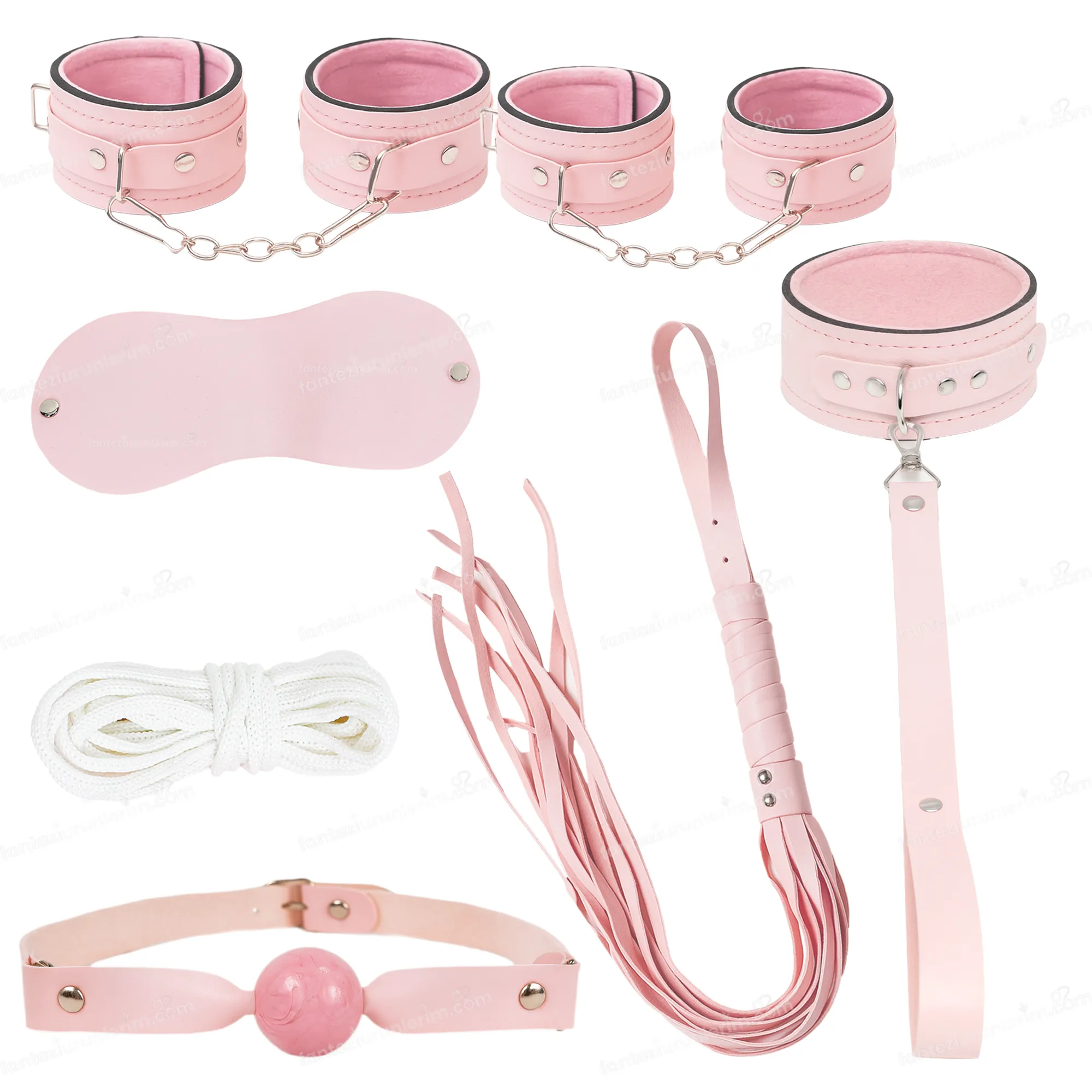 Fantezi aletleri arasında hem estetik hem de işlevsel yapısıyla öne çıkan bu pembe deri BDSM seti, şehvetli keşiflerinize zarafet katmak için tasarlandı. Fantezi ürünleri alanında özgünlüğü ve kalitesiyle dikkat çeken bu set, pembe rengin yumuşak çekiciliğini BDSM’in sert sınırlarıyla birleştiriyor.