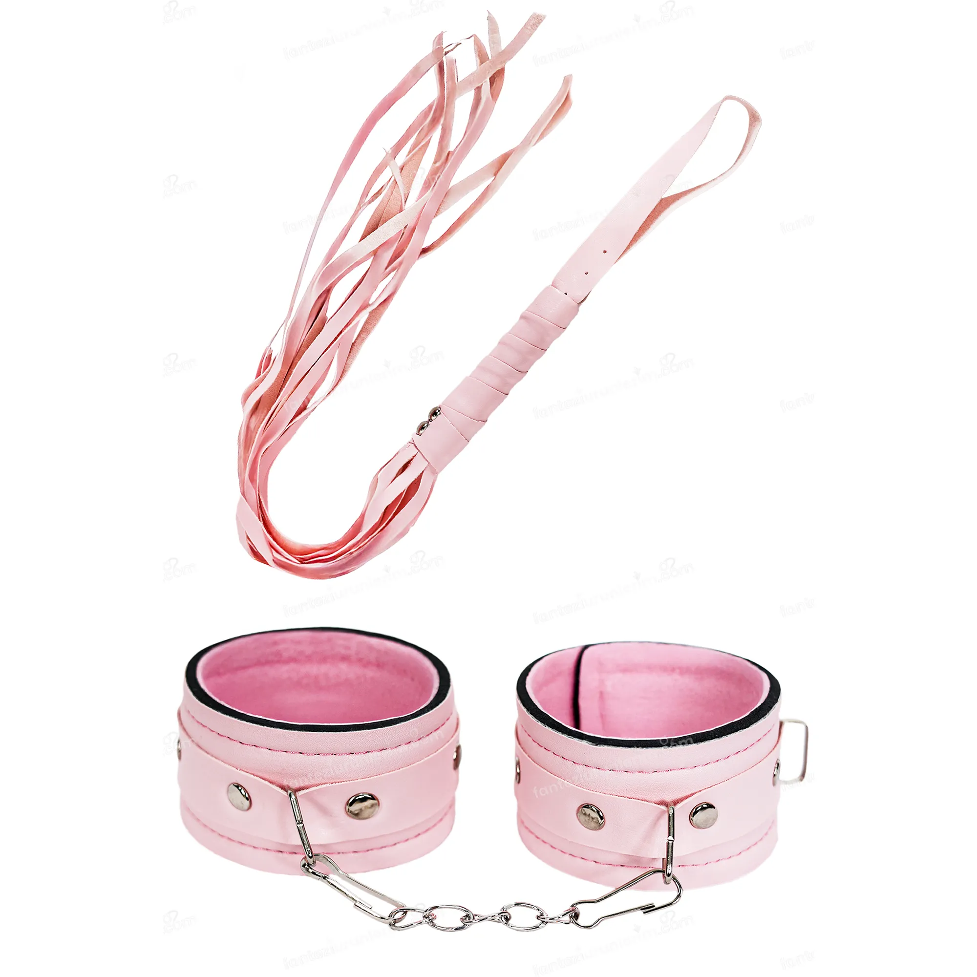 Fantezi Aletleri – Seks Kelepçesi ve Deri Kırbaç Seti – Pembe
